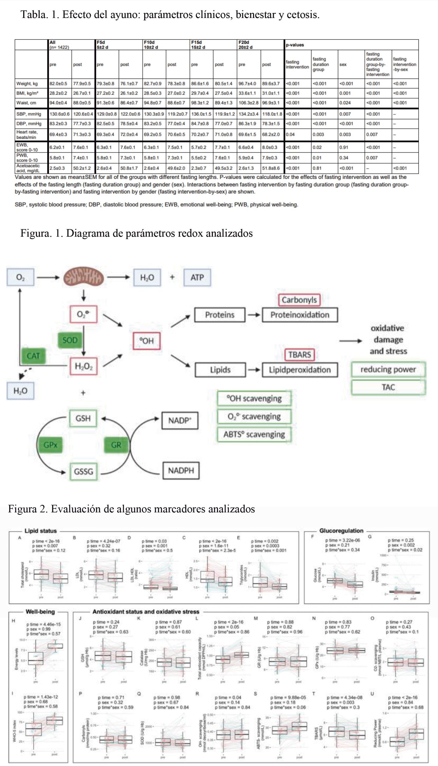 Reduce la peroxidación lipídica y mejora varios indicadores metabólicos, especialmente los lípidos. (10) El poder reductor, la capacidad de captación de ciertos radicales aumentan los niveles circulantes de antioxidantes. (11) Estimu-lación de la maquinaria enzimática antioxidante disminuyendo el daño oxidati-vo y la inflamación. Al activar la autofagia y estimular la división de las células madre, el ayuno puede contribuir al rejuvenecimiento de los tejidos.