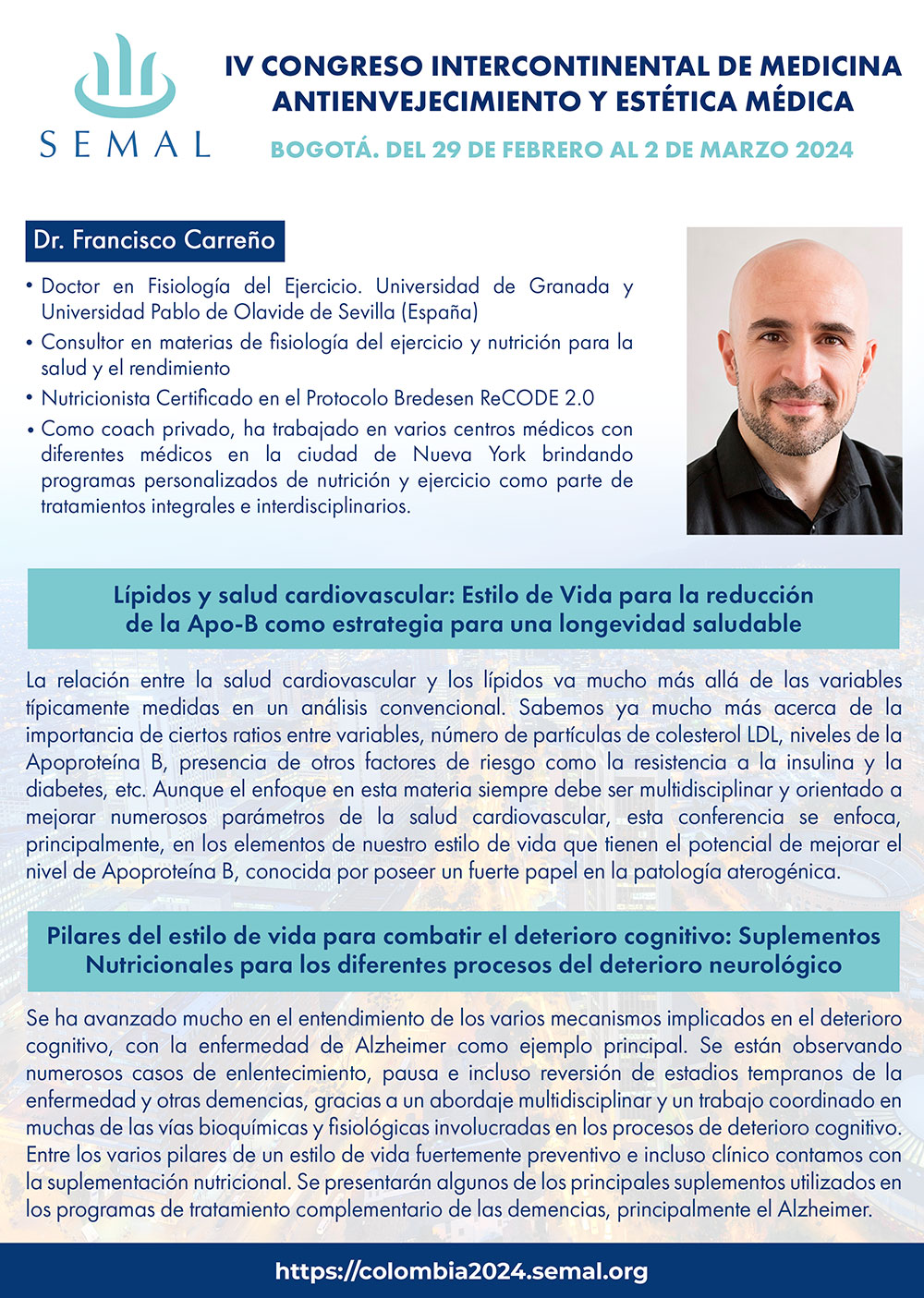 El Dr. Francisco Carreño (USA) hablará en nuestro IV Congreso sobre lípidos y salud cardiovascular, y suplementos nutricionales para frenar el deterioro neurológico por SEMAL | 20 Dic 2023 | Uncategorized